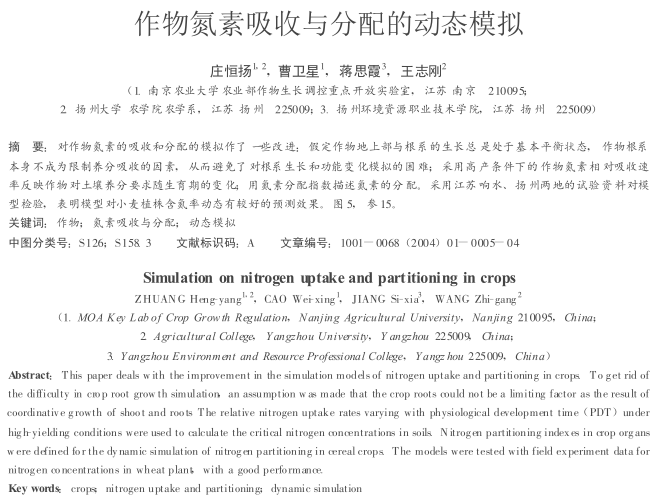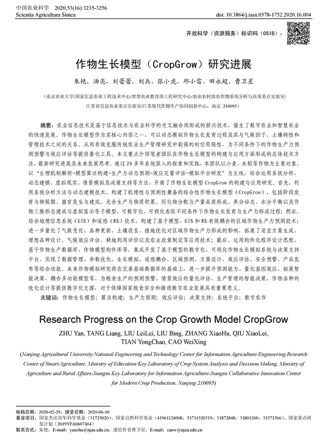 本文重点介绍笔者团队在作物生长模型的构建与应用方面形成的总体技术方法、最新研究进展及未来发展思考。通过 20 多年系统深入的探索和实践,本团队以小麦、水稻等作物为主要对象,以“生理机制解析-模型算法构建-生产力动态预测-效应定量评估-模拟平台研发”为主线,综合运用系统分析、动态建模、虚拟现实、情景模拟及决策支持等方法,开展了作物生长模型 CropGrow 的构建与应用研究。